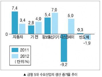 일반기계와 자동차 수출은 신흥국 수요 증가와 브랜드 인지 도 제고로 호조를 띨 것이다. IT 산업군은 런던 올림픽 특수와 국내 기업의 경쟁력 제고에 힘입어 3.5% 증가하면서 2011년 부진에서 회복될 것이다.