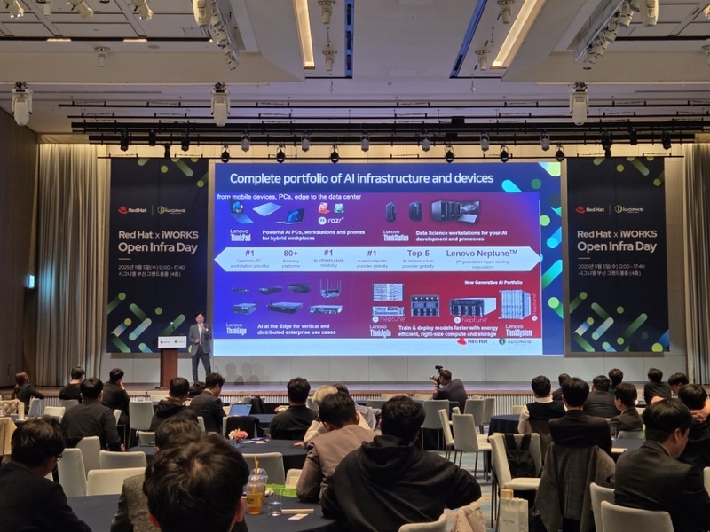 레노버 글로벌 테크놀로지 코리아(ISG)는 5일 부산에서 열린 ‘레드햇 x 아이웍스 오픈 인프라 데이(Red Hat x iWORKS Open Infra Day)’ 행사에 참가해 차세대 데이터 센터를 위한 인프라 전략을 발표했다. 레노버는 행사에서 AMD 에픽(EPYC) 프로세서 기반의 고성능 서버 ‘씽크시스템(ThinkSystem) SR665 V3’를 전시하며, 효율성과 확장성을 동시에 확보한 AI 인프라 혁신 사례를 소개했다.