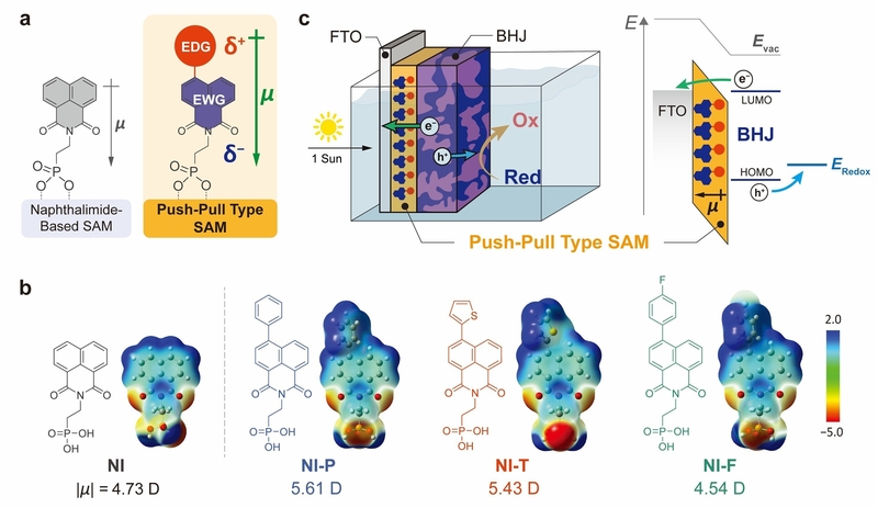 연구팀은 박막을 이루는 분자를 ‘푸쉬-풀 구조’로 설계해 이 같은 물질을 개발할 수 있었다. 푸쉬-풀은 한 분자 안에 전자를 밀어내는 부분과 당기는 부분이 공존하는 구조로, 이 구조의 분자들은 힘을 합쳐 강한 전기장을 형성할 수 있다. 형성된 전기장은 에너지 장벽을 낮추는 역할을 해 전자가 자기조립분자박막을 뚫고 이동하는 ‘전자 터널링’ 현상이 활성화되는 원리다.