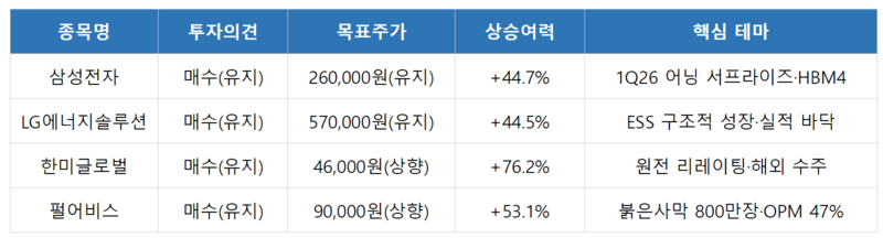 키움증권은 삼성전자에 대해 목표주가 26만원, 투자의견 매수(Buy)를 유지했다. 현재가 17만9,700원 대비 상승여력은 44.7%다. 최근 주가 급락을 투자 기회로 판단하며 반도체 업종 내 Top Pick 의견을 유지했다.