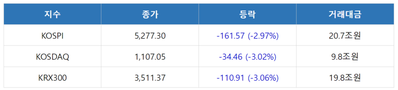 KOSPI는 전주말 해외증시 약세 및 유가 급등 등 영향으로 하락 출발한 가운데, 외국인 매도세가 연일 이어지면서 2차전지를 제외한 대부분의 업종이 약세를 보이며 3%대 하락 마감했다. 3일 연속 하락이다. 대형주(-3.0%), 중형주(-2.6%), 소형주(-1.7%) 모두 약세를 보였다. 업종별로는 증권(-6.3%), 의료·정밀기기(-4.2%), 기계·장비(-4.1%), 금융(-4.0%) 등이 하락을 주도했다. 투자자별로는 기관(+8,814억원)과 개인(+9,016억원)이 순매수한 반면 외국인(-2조1,335억원)은 대규모 순매도했다.