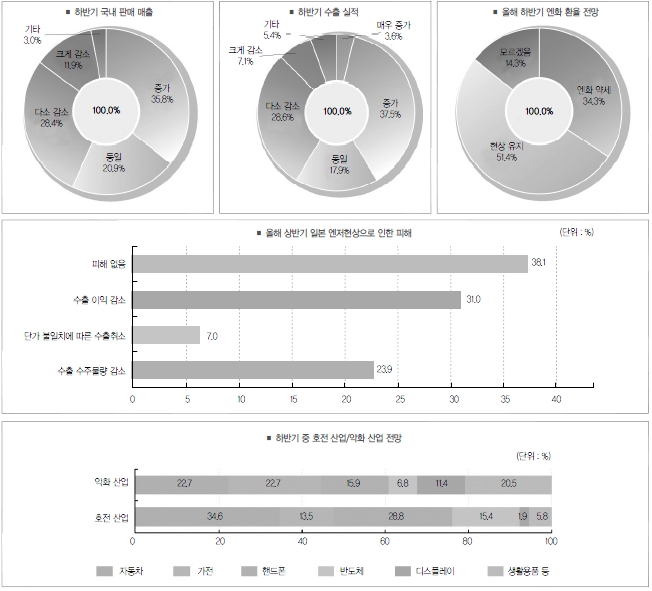 한편 올해 하반기 엔화 환율을 어떻게 전망하는가의 질문에는 현상 유지할 것으로 업계는 전망하고 있으나, 상반기와 같이 급격한 변화는 없을 것으로 보여 환율 변동에 따른 영향은 제한적일 것이라는 의견도 대두되고 있다.