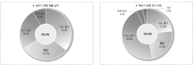 설문조사에 응답한 조합원사의 상반기 매출액은 지난해와 비교해 증가했다고 답한 비율이 35.6%, 감소했다고 답한 비율이 34.2%로 비슷하게 조사되었다. 그러나 금형매출이 크게 증가하였다는 응답은 없는 가운데, 크게 감소하였다고 응답한 조합원사는 8.2%에 달해 경기 둔화 현상이 일부 업체에 큰 영향을 나타내기도 하였다.