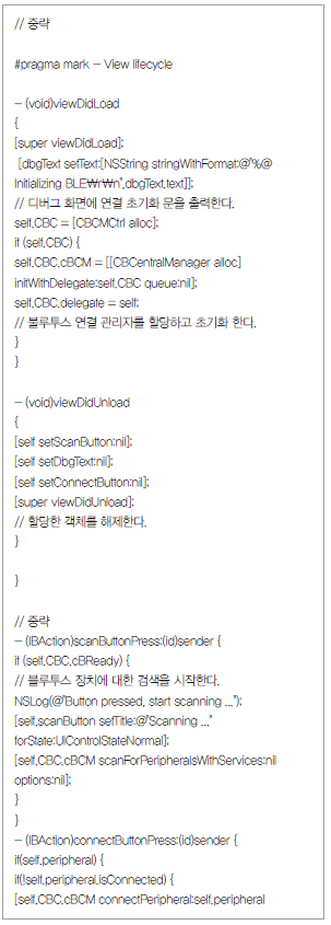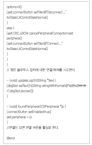 scanForPeripheralsWithServices라는 메소드는 특정한 블루투스 장치를 검색할때 사용한다. 하지만 현재 테스트 프로그램에서 찾고자 하는 블루투스 장치나 종류를 지정하지 않고 찾기 때문에 인자를 nil로 설정하고 검색하게 된다. 검색된 장치는 self.peripheral에 저장되어 있다가 connect Peripheral:self.peripheral를 호출하면서 최종 연결 되게 된다.