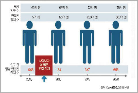 2007년을 기점으로 각 개인들은 1개 이상의 디바이스를 보유하게 됐다(그림 1). 이는 사람보다 연결 장치가 더 많아졌다는 것을 뜻한다. 2003년, 세계 인구수는 63억 명이었고 연결된 장치 수는 5억 개로 인구 한 명당 연결된 장치 수는 0.08개에 불과했다. 그러나 2010년 세계 인구는 68억 명, 연결된 장치 수는 125억 개에 달해 인구 한 명당 연결된 장치 수는 1.84개로 폭발적인 증가를 보였다. 2015년에는 3.47개, 2020년에는 6.58개로 각 개인이 갖는 디바이스의 수는 계속해서 증가할 것으로 전망된다.