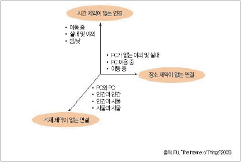이러한 IoT 디바이스의 증가는 궁극적으로 모든 것이 연결되는 초연결세계로 나아가는 초석이 될 것이다. 초연결세계는 그림 2와 같이 시간, 장소, 객체의 제약이 없는 연결이 주가 되는 것을 뜻한다. 초연결세계에서는 방대한 양의 정보 교환이 가능해지고, 이로 인해 자원을 효율적으로 활용하고 능동적으로 대응하는 것이 가능해진다. 따라서 다양한 사회적 기회 역시 창출될 전망이다. IoT의 성장은 또한 최적화, 통합적 운용 관리, 노하우 또는 구조의 패키지화 등의 기능을 촉진할 수 있을 것으로 보인다.