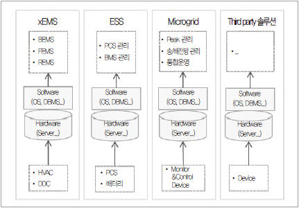 SW 플랫폼은 효율적인 서비스 연계와 데이터 전송이 가능한 표준 프레임워크로, 표준 정보 모델 및 인터페이스 등의 집합 체계이다. 상호 연동 및 시너지 창출을 도모하며, 궁극적으로는 발전 및 운영비용을 감소시키고, 안정적 전력망을 운용할 수 있다. SW 플랫폼 도입 전과 도입 후의 차이는 그림 5과 그림 6에서 알아 볼 수 있다.