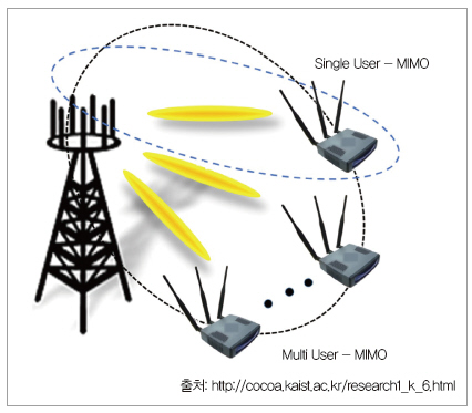 5G 모바일의 두 번째 특장점은 MU-MIMO(Multi User-Multiple Input and Multiple Output ; 다중이용자-다중입출력, 그림 3) 기술에 의한 에너지 효율 증대다. 이는 다중 이용자에게 무선 리소스를 분배하는 기술이며, 기지국에 수십 혹은 수백 개의 안테나를 장착하여 같은 자원으로 수십 명의 이용자를 동시 지원함으로써 용량 및 에너지 효율을 증대시킨다.(2)