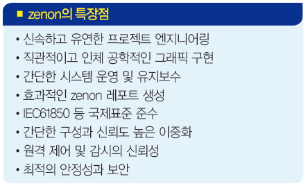 zenon은 엔지니어링이 쉽고, IEC61850 과 DNP3 등과 같은 다양한 프로토콜 드라이버를 내장하고 있으며, 모든 디자인 개체의 XML import/export가 가능하다. 또한, VSTA나 VBA 등 프로그램 인터페이스가 용이할 뿐만 아니라, zenon Logic이 IEC61131-3의 모든 기능을 수용한다. 이러한 장점으로 호주 퀸즐랜드에 있는 변전소와 한국동서발전의 당진화력발전소에 이 솔루션이 적용됐다.