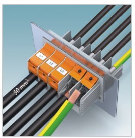 피닉스컨택트의 신제품 TW 50 고전류 피드스루 단자대는 새로운 T-LOX 연결 기술이 적용되어 토글(toggle) 레버를 이용한 체결이 가능하며, 편리하고 신뢰도 높은 케이블 연결 작업을 수행한다.