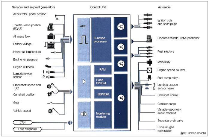 그림 4는 전자 제어 전장 시스템의 일종으로 EMS(Engine Management System)의 시스템 블록을 도식화한 것이다[보쉬의 EMS 중 하나인 모트로닉(Motronic) 시스템 사례].