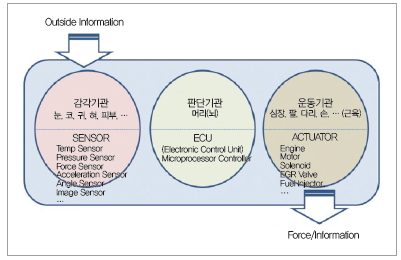 자동차 전장시스템은 유기 생명체와 마찬가지로 기본적으로 유기 생명체의 감각기관에 해당하는 감지부(Sensor Part : 예를 들면 압력 센서, 가속도 센서, 각속도 센서, 유량 센서, 온도 센서 등), 두뇌에 해당하는 전자 제어부(ECU Part), 근육에 해당하는 구동부(Actuator Part : 예를 들면 엔진, 모터, 솔레노이드 등) 세 가지 요소로 구성돼 있다(그림 5).