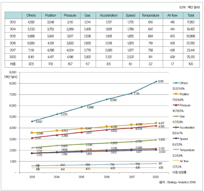 스트래티지 애널리틱스에 따르면, 세계 자동차 전장 시스템은 자동차 산업 성장률보다 월등히 높은 연평균 6.9% 이상의 고성장을 이룰 것으로 전망되며, 시스템별 센서 비중은 파워 트레인 40.9%, 안전 32%, 섀시 17.2%, 보디 7.7% 순이고, 성장률 측면에서는 운전정보 분야 14.2%, 안전 분야 10.6%, 보디 8.1%, 보안 8.0% 순으로 고성장을 이룰 것으로 전망된다.