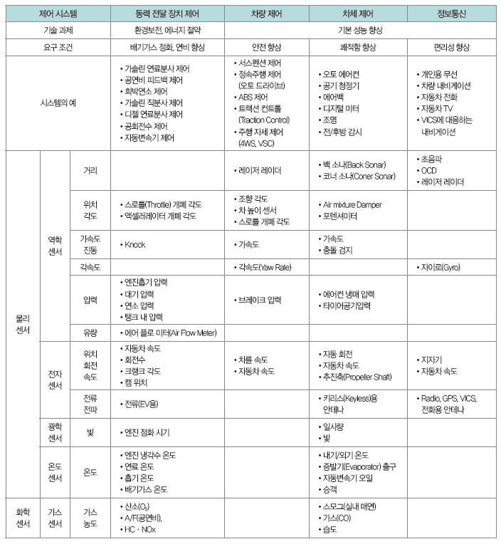 표 2. 자동차 전자화 시스템별 센서 적용 분야