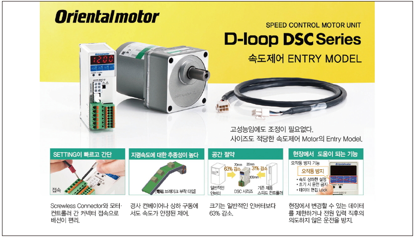 오리엔탈모터의 DSC 시리즈는 ‘AC 모터와 속도 제어 컨트롤러 유닛’ 제품으로 단상 INDUCTION 모터와 콤팩트한 사이즈, 저소음, 장수명 컨트롤러로 구성되어 있다. 사용의 용이성을 향상시키기 위해 스피드 컨트롤러에 운전 패널을 장착했으며 디지털 설정을 위한 다양한 기능을 추가했다.