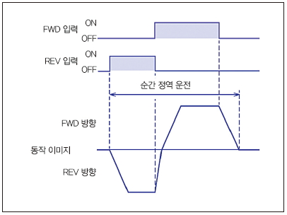 (2) INDUCTION 모터의 순간 정/역 운전을 실현 : 기존품은 순간 정/역 운전을 할 경우 REVERSIBLE 모터를 사용해야 하며, 운전 시간에 제한이 있었다. 그러나 DSC 시리즈는 새로운 제어 기술에 의한 INDUCTION 모터의 순간 정/역 운전을 실현했다. DSC 시리즈는 INDUCTION 모터이기 때문에 연속 운전이 가능하다(그림 4 참조).