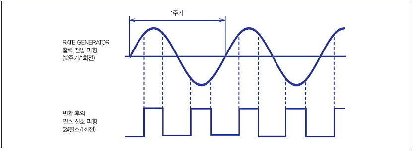 AC 속도 조절 모터는 회전 속도 검출용 RATE GENERATOR를 모터부에 탑재하고 있다. RATE GENE-RATOR는 1회전당 12펄스의 정현파 단상 교류 전압이 발생하므로 이를 펄스 신호로 변환하고 모터 속도를 검출한다. 단상 교류 전압 때문에 회전방향은 검출할 수 없다(그림 7 참조).