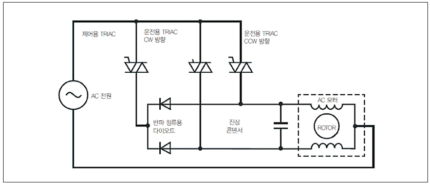 TR- IAC의 점 원호각을 제어하여 모터 인가전압을 조정한다. TRIAC은 운전용과 제동용을 탑재하고 있으며, 순간 정지할 때는 제동용 TRIAC을 ON로 하는 것으로 모터 코일에 직류 성분의 브레이크 전류를 흘리고 감속 토크를 발생시킨다.