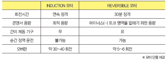 표 2. INDUCTION 모터와 REVERSIBLE 모터의 비교