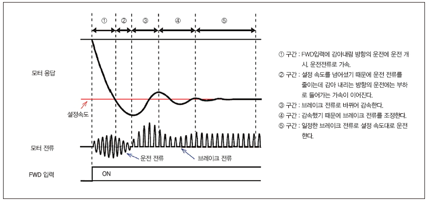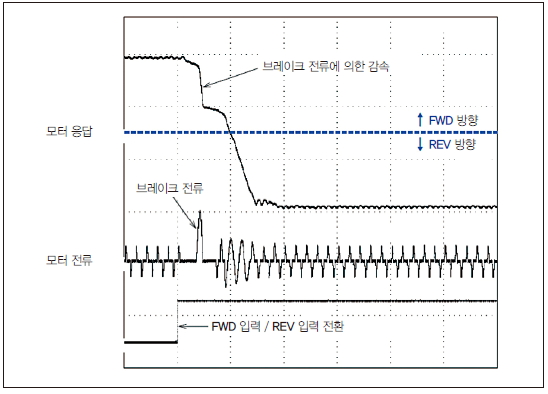 다만, 순간 정/역 운전 시에는 브레이크 전류와 반대방향으로 모터 구동 전류가 통상적인 운전 때보다 큰 전류로 흘러가기 때문에 한 방향 연속운전에 비하면 발열이 커진다. 그래서 자주 순간 정/역 운전을 반복하면 모터 과열 보호가 작동할 가능성이 있다. 그림 12와 같이 반복주기로 운전하면 확실히 연속운전이 가능하다.