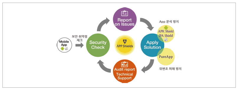 APP Shields는 모바일 앱의 취약점 분석 및 진단 제공, 다양한 해킹 공격으로부터 모바일 앱을 보호, 불법적인 위변조를 감지하여 앱 실행을 중지, 보안위협 상태의 감시 및 보고 등의 기능을 제공한다.