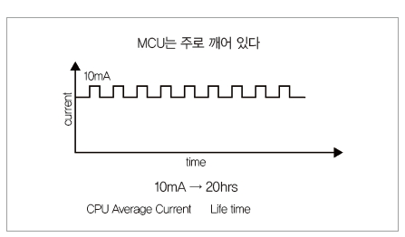 현재 대부분의 스마트 시계는 약 200mAh 용량의 배터리를 사용한다. 이 배터리는 일반적으로 공간이 협소하게 제한된 시계 내부에 적합한 상당히 작은 크기이다. 그림 2에서 설명된 바와 같이 MCU가 평균 10mA를 소비한다고 할 때, 배터리는 20시간 동안 사용할 수 있지만, MCU가 동작 중에 완전 휴면 상태가 된 경우, 평균 전력 소비를 현저히 감소시킬 수 있다.