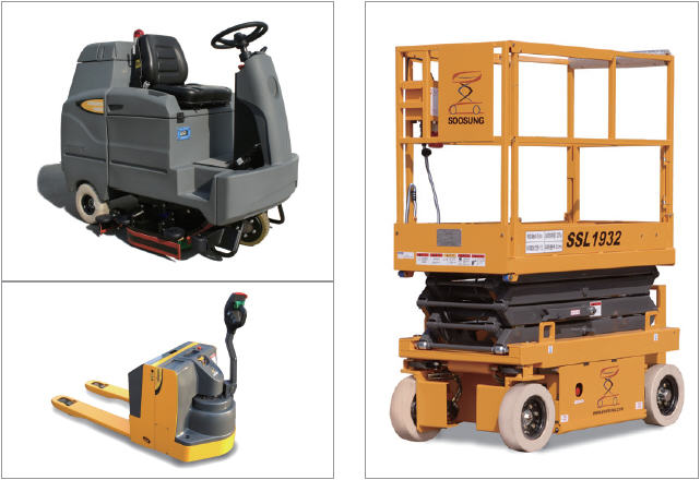 청소장비 중 탑승형 습식청소차는 한국인 체형에 맞게 설계되어 작업자의 피로감이 덜하고 작동이 용이하여 마트, 공장, 물류센터, 지하 주차장 등 넓은 장소 청소에 적합하다.
