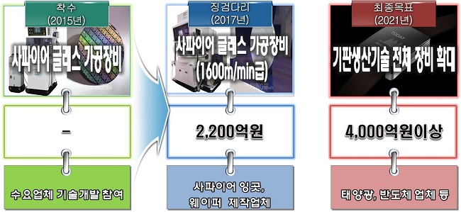 예를 들어, ‘사파이어 글래스’ 가공 장비의 경우 디스플레이용 사파이어 소재 회로판(웨이퍼)을 고정밀, 고생산성으로 가공하는 기술 개발 내용으로, 공급 기업인 장비 제조사와 이를 활용하는 수요 기업인 사파이어 글래스 생산 기업이 공동으로 참여하고 있다. 올해부터 기술 개발에 착수, 기존보다 성능(1,200m/min급)과 생산성이 우수한 초고속 가공 장비를 개발(1,600m/min급)하여 2,200억 원 규모의 기존 장비 시장을 대체할 계획이다.