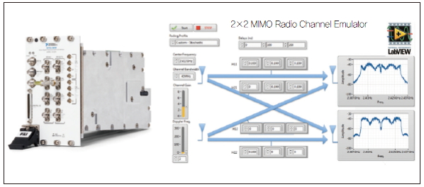 수학 페이딩 모델을 FPGA에 프로그래밍하면 VST는 리얼타임 라디오 채널 에뮬레이터를 실행한다. 그림 7(우)는 LabVIEW에서 2개의 VST를 사용하여 실행된 2×2 MIMO 라디오 채널 에뮬레이터이다.
