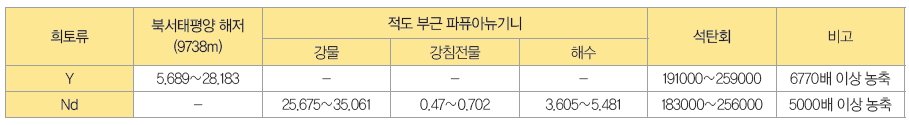 표 2. 세계 Y/Nd 매장 광상 발굴 현황 (단위 : μg/kg)