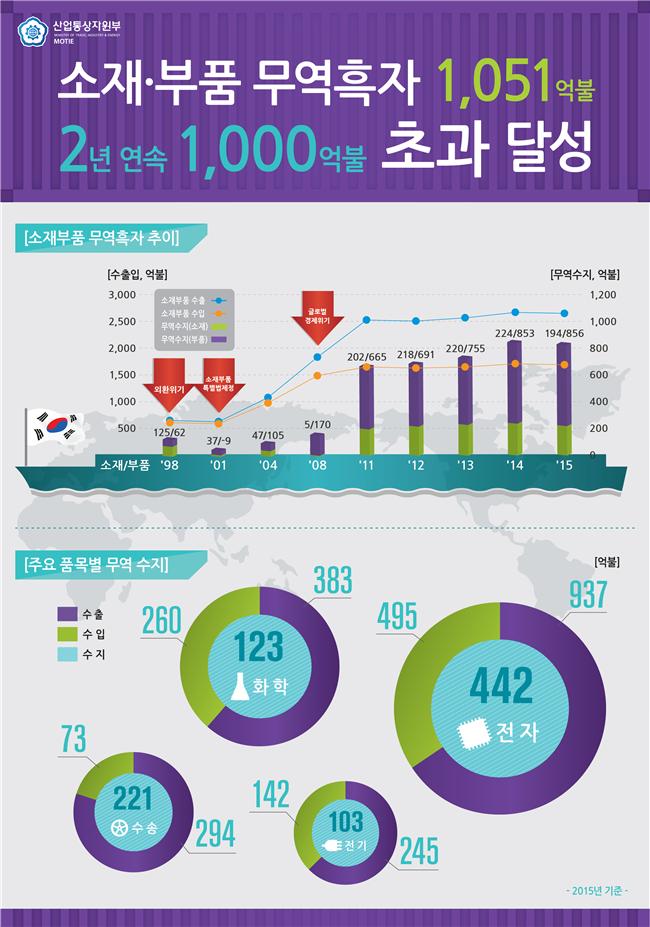 2015년 소재부품 무역흑자가 1,051억 달러를 기록해 전년에 이어 2년 연속 1,000억 달러를 넘어섰다. 지난해 소재부품 수출비중이 사상 최초로 50%를 넘어서며, 저유가와 엔저, 신흥국 경기부진 등 어려운 여건 속에서도 우리 경제의 든든한 버팀목이 되어 주었다.