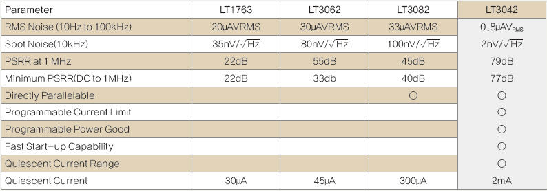 ▲ 표 1. LT3042와 기존 저잡음 LDO의 비교