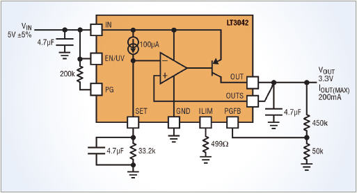 리니어 레귤레이터(LT3042)는 고성능 LDO 리니어 레귤레이터 제품으로, 잡음은 낮고 PSRR은 뛰어난 리니어 테크놀로지의 아키텍처를 사용함으로써 잡음에 민감한 애플리케이션을 구동하는 데 적합하다. 또한 높은 성능과 함께 단순성과 견고성도 겸비하고 있다.