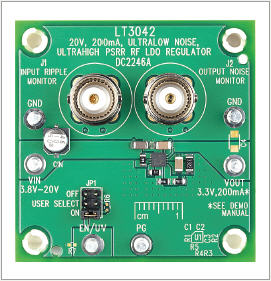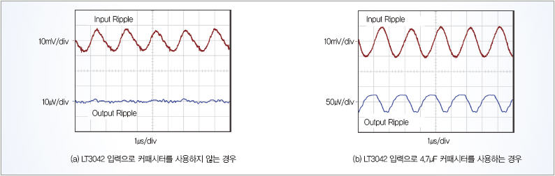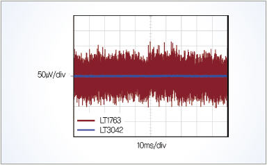 10Hz~100kHz까지의 대역폭으로 출력 잡음이 0.8㎶RMS(이 수준의 잡음과 PSRR을 적절히 측정하려면 각별한 주의와 특수한 계측기가 필요하다)인 LT3042는 잡음이 1㎶RMS 미만인 레귤레이터이다.