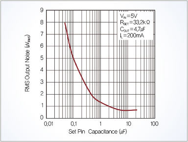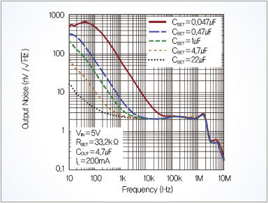 SET 핀 커패시터(CSET)는 레퍼런스 전류 잡음, 베이스 전류 잡음(입력 스테이지의 오차 증폭기의 잡음), SET 핀 저항(RSET)의 근본적인 열 잡음을 우회할 수 있도록 한다. 그림 4와 같이 CSET을 높이면 저주파 잡음 성능이 크게 향상된다.