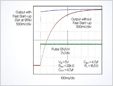 출력 잡음을 낮추기 위해 SET 핀 바이패스 커패시턴스를 높이면, 일반적으로 스타트업 시간이 늘어난다. 하지만 LT3042의 신속한 스타트업 회로는 이러한 문제를 완화해 준다. 이 회로는 2개 저항을 사용해서 편리하게 구성할 수 있다. 그림 6은 스타트업 시간이 극적으로 향상되는 것을 나타낸 것이다.