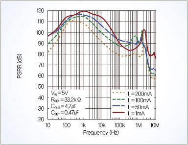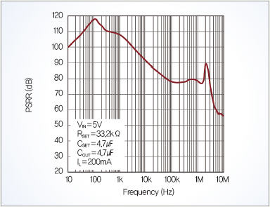 LT3042의 높은 PSRR은 잡음에 민감한 애플리케이션 구동 시 중요한 요소이다. 그림 7은 이 레귤레이터의 뛰어난 저주파 및 고주파 PSRR 성능을 나타낸다. 100Hz일 때 거의 120dB에 이르며, 1MHz일 때 79dB, 3MHz일 때 70dB 이하라는 것을 알 수 있다. 또한 그림 8과 같이, PSRR 성능은 부하 전류가 낮아짐에 따라 더 우수해진다.