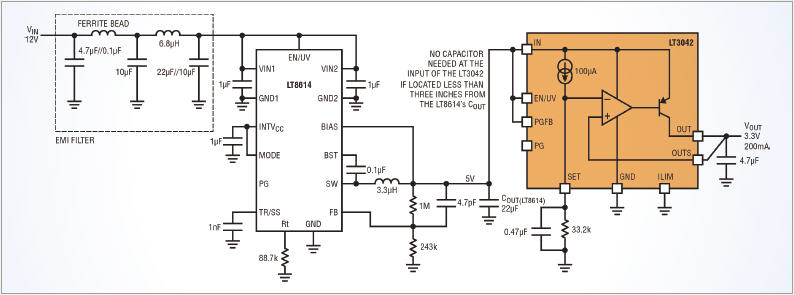 ▲ 그림 10. LT3042가 LT8614 사일런트 스위처(Silent Switcher) 레귤레이터를 포스트 레귤레이트할 때
