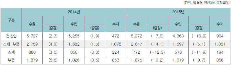 산업통상자원부에서 발표한 ‘2015년 소재·부품 교역동향(잠정)’에 따르면, 수출은 전년대비 4.1% 감소한 2647억 달러를 기록, 총수출(5272억 달러)의 50.2%를 차지했다. 소재·부품의 수출비중은 2014년 대비 2% 포인트 증가해 사상 최고치를 기록했다. 나라별로는, 베트남으로의 수출 증가(35.2% 증가)에 힘입어 대아세안 수출이 소폭 증가한 반면, 유럽과 일본 등 대부분 지역으로의 수출은 감소했다.
