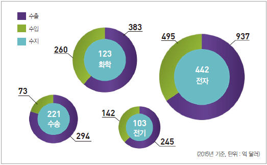 그리고 전자부품의 경우, 반도체는 D램 재고량과 가격 하락에도 불구하고 모바일용 고용량 D램 수요 증가로 상쇄할 수 있었고, 무선통신기기는 해외 생산거점(중국, 베트남 등)으로 부품 수출이 확대됐다.