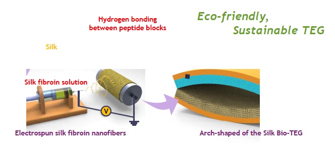 ▲ 천연 바이오 재료인 실크와 간단하고 저비용 기법인 전기방사를 사용하여 만든 마찰 전기 발전기