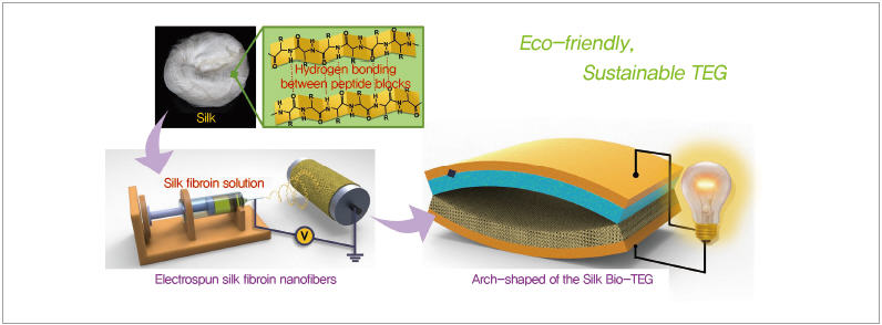 ▲ 그림 1. 천연 바이오 재료인 실크와 간단하고 저비용 기법인 전기방사를 사용해 만든 마찰 전기 발전기
