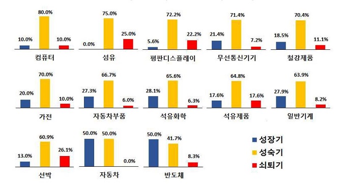 업종별로는 성숙기에 접어들었다는 응답이 ‘컴퓨터’(80%), ‘섬유’(75.0%), ‘평판디스플레이’(72.2%), ‘무선통신기기’(71.4%)에서 많은 반면 ‘자동차’(50.0%)와 ‘반도체’(41.7%)는 적게 나왔다. 쇠퇴기라는 응답은 ‘선박’(26.1%), ‘섬유’(25.0%), ‘평판디스플레이’(22.2%) 순으로 높았다.