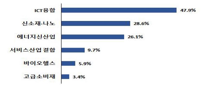 산업별로는 ‘ICT 융합’이 47.9%로 가장 많았으며 ‘신소재‧나노’(28.6%), ‘에너지신산업’(26.1%), ‘서비스산업 결합’(9.7%), ‘바이오헬스’(5.9%), ‘고급소비재’(3.4%) 등이 뒤를 이었다.〈복수응답〉 ‘ICT 융합’의 대상에 대해서는 ‘사물인터넷‧스마트홈’(43.9%), ‘드론‧무인기기’(30.0%), ‘3D프린팅’(12.3%), ‘인공지능‧로봇’(11.5%), ‘가상‧증강현실 시스템’(4.3%)을 들었다.