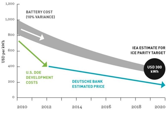 국가들의 기술개발 투자 우선순위는 배터리에 집중되어 있으며, 이는 배터리가 전기자동차 비용의 대부분을 차지한다고 판단하기 때문이다. 보고서에 따르면 배터리 비용은 지난 4년(2008년~2012년) 동안 절반 이상으로 떨어지고 있다. 미국 에너지부(DOE)는 배터리 가격이 2008년 kWh당 1,000달러였던 것에서 2012년 말 kWh당 485달러로 낮아졌다고 보고했다. 도이치뱅크는 2020년 배터리팩의 가격은 kWh당 300달러로 낮아질 것으로 예상하였다. 결국 전기자동차의 성패는 배터리의 가격에 의존한다고 예측할 수 있다.