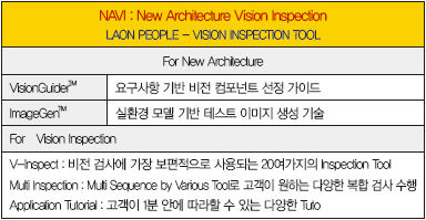 이처럼 그동안 볼 수 없었던 새로운 설계 철학을 적용한 스마트한 비전 검사 소프트웨어 NAVI를 통해 비전 검사는 어렵고 돈이 많이 든다는 선입견을 깨고 머신비전의 대중화를 이끌 것이다.