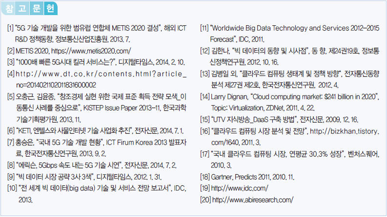 5G 이동통신 시스템 관련 국제 표준 및 기술 시장 선점을 위한 글로벌 경쟁은 이미 시작되었다. 5G 이동통신 시스템 주변 기술 중 핵심 기술인 사물인터넷 기술력을 확산시키고 기술사업화를 위해 정부출연연구원과 관련 기업이 공동으로 사업을 추진하고 있어 사물인터넷 관련 업계의 관심과 아울러 파급 효과를 기대하고 있다.