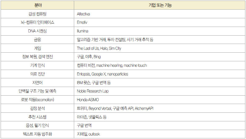 ▲ 표 1. 다양한 인공지능 기술 및 적용 분야