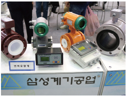 또한 이날 관람객들의 이목을 집중시킨 초음파 다회선 유량계는 관로에 설치된 상류 측 변환기와 하류 측 변환기가 서로 주고받은 초음파의 시간차를 구해 배관 내 다측정선상의 유속 V를 측정, 유량을 산출하는 고정밀 유량계로서 직관부 유지가 어려운 현장에서 측정 오차를 최소로 줄여 준다.