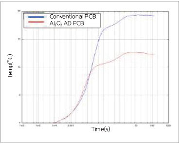 둘째, 낮은 열저항으로 소자 동작 온도를 낮춘다. Metal PCB에 적용시 기존 Metal PCB에 비해 소자의 동작 온도를 낮출 수 있기 때문에 LED 및 고출력 소자용 기판에 적용이 가능하다.